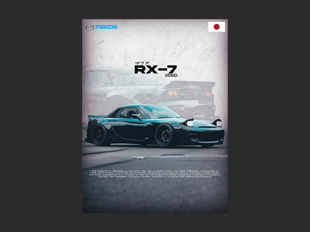 This captivating design pays homage to the iconic RX-7 FD3S, showcasing its timeless curves and dynamic presence in stunning detail. Whether you're a devoted enthusiast or simply appreciate automotive beauty, this poster is a must-have addition to any collection.