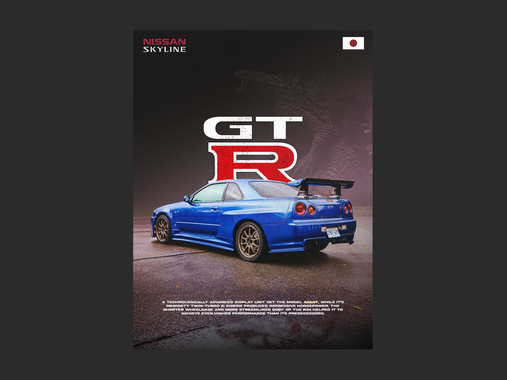 Embark on a thrilling journey through automotive legend with our R34 Nissan Skyline GTR digital print poster.